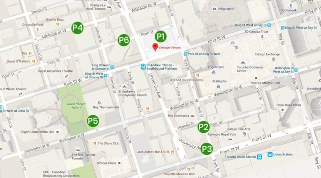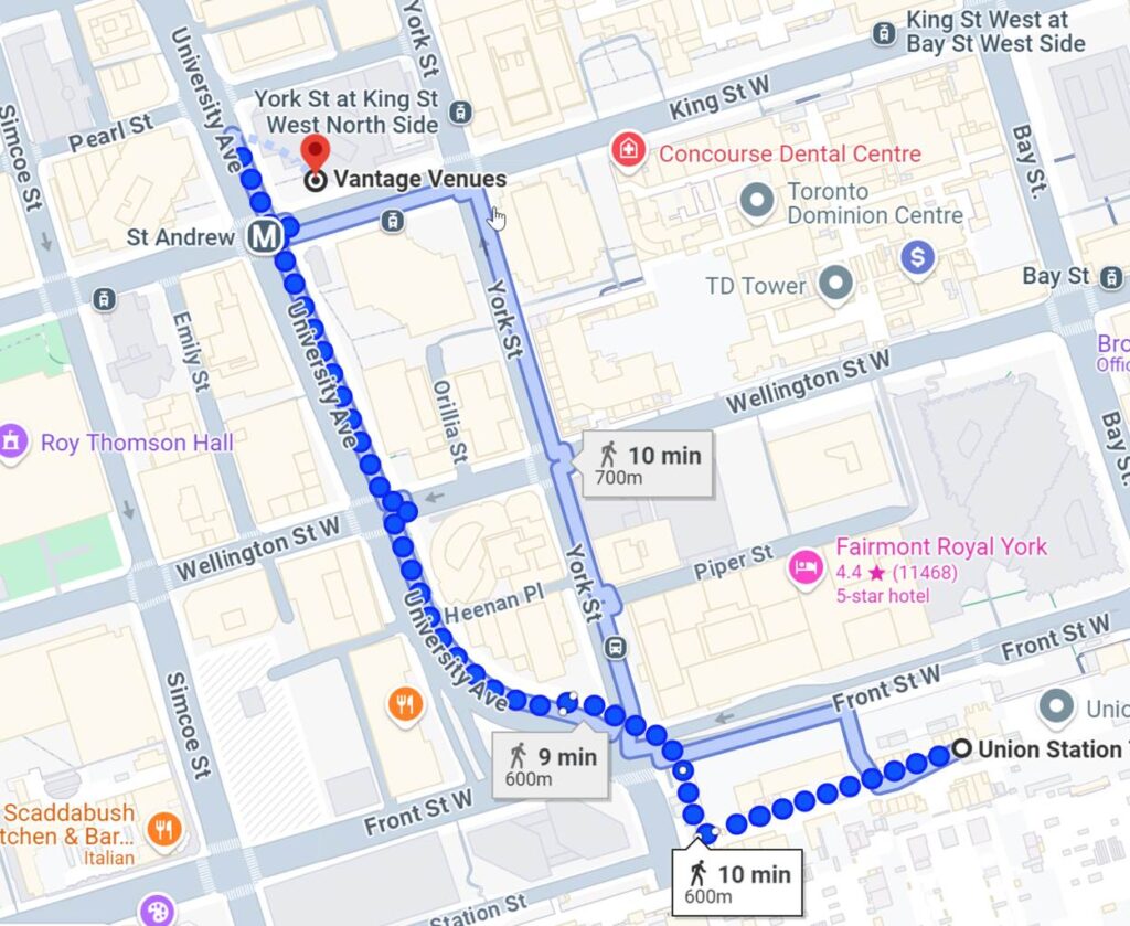 Vantage Venues is just a short five-minute walk up York Street or University Avenue from the west end of Union Station.